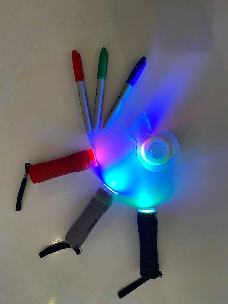 Para poder hacerlo EN CASA, colocamos cinta adhesiva transparente sobre la luz de la linterna (para protegerla) y la coloreamos con marcadores indelebles: una color ROJO, otra VERDE y por último AZUL. ¡Súper fácil!