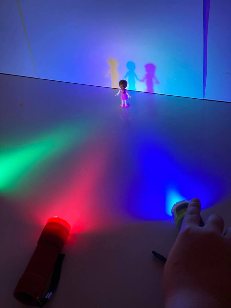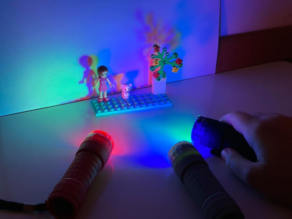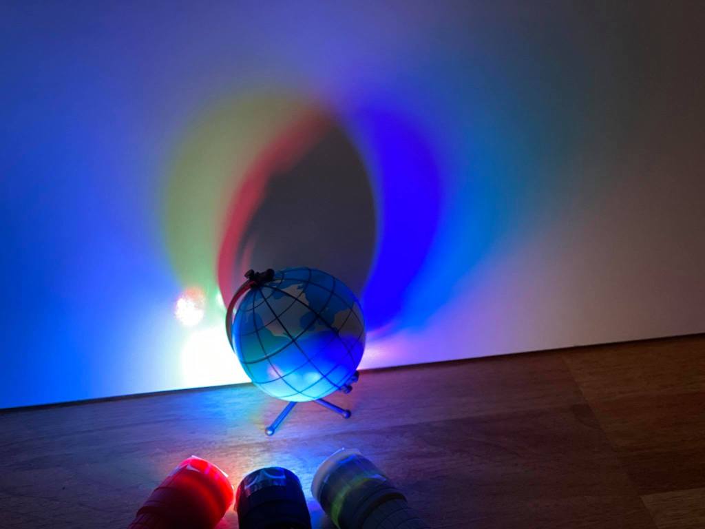 De esa forma logramos que la luz se proyecte de colores, al apuntar las 3 linternas a un mismo punto, los colores se fundirán formando luz BLANCA, y al colocar cualquier objeto por delante descubrirán las famosas SOMBRAS DE COLORES.