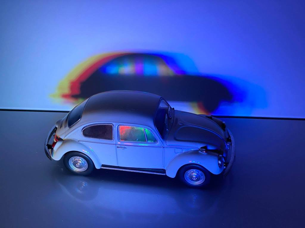 Con estas tres luces puede hacer sombras de siete colores diferentes (azul, rojo, verde, negro, cian, magenta y amarillo)